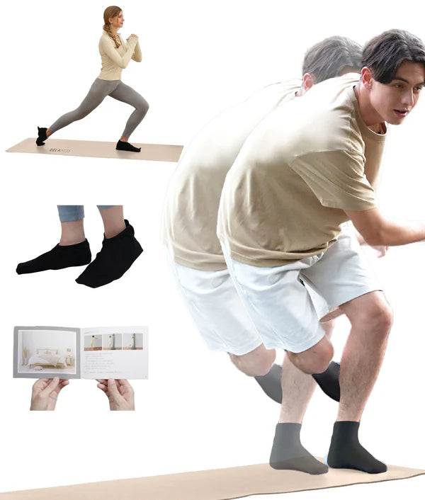 付属のソフトシューズを素足に着用するとスライドマットと足裏の間の摩擦が最小限に抑えられるため、無駄な力みや動きが入らないスムーズな滑りができます。